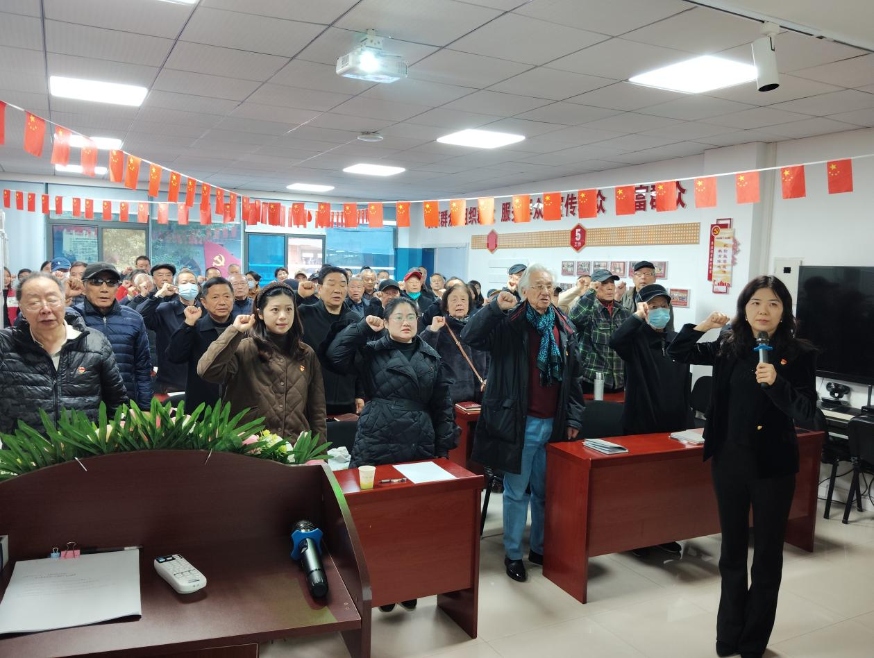 在全体党员齐唱国歌的庄严旋律中,主题党日活动正式拉开帷幕。金地社区党委书记普娜带领全体党员面向党旗,举起右拳重温《入党誓词》,铮铮誓言铿锵有力,凝聚了校社党员携手践行全会精神的思想共识与行动自觉。